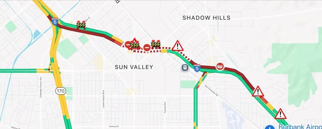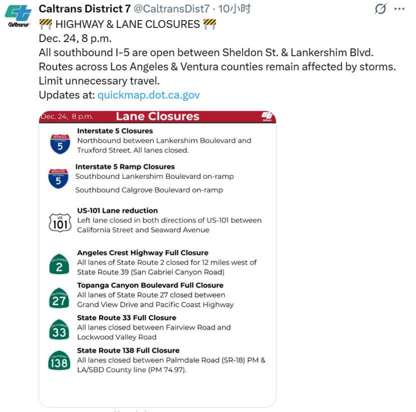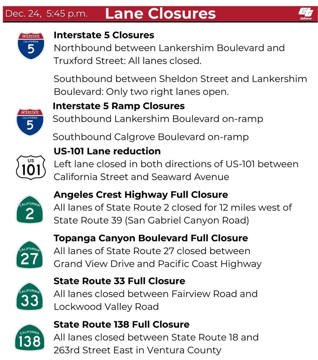 加州交通局(Caltrans)于周二晚上宣布了在北行5号高速公路Lakershim大道的车道关闭。27号州道在Grand View大道和太平洋海岸公路之间的部分路段也已关闭。