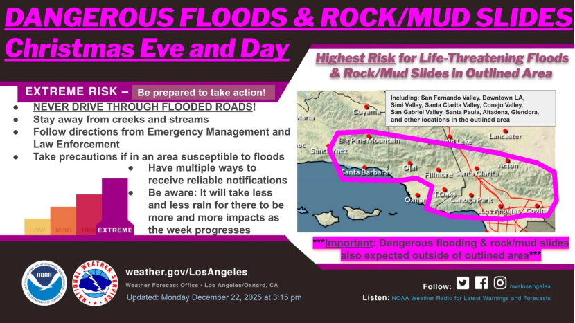 这场冬季风暴于12月23日(周二)晚间开始侵袭加州,并在平安夜(12月24日)迅速增强,成为近年来最严重的圣诞假期风暴之一。国家气象局(NWS)发布罕见的“高风险”过度降雨警报,影响洛杉矶、圣贝纳迪诺、文图拉和圣巴巴拉等县,覆盖超过700万人。气象学家阿里尔·科恩警告:“这是一场持续多日的长时间事件,雨水累积将导致广泛的生命威胁性洪水,以及危险的泥石流。”