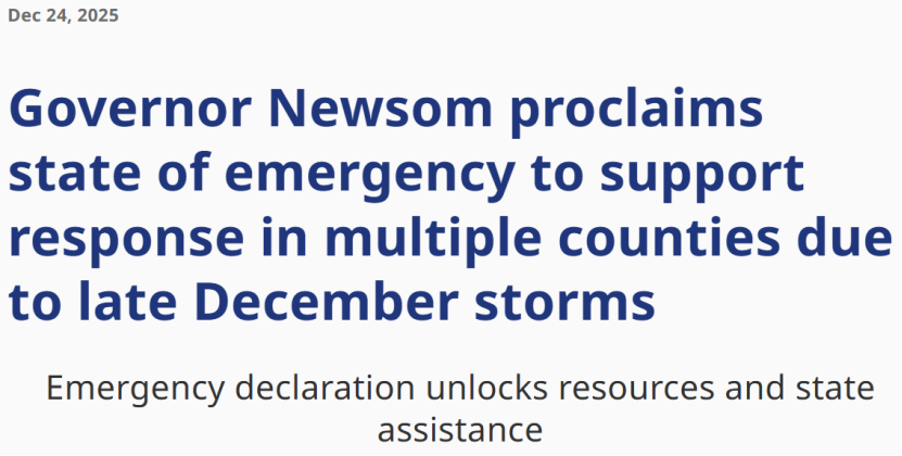 本周三(12月24日),州长加文·纽森宣布洛杉矶县、橙县、河滨县、圣贝纳迪诺县、圣地亚哥县和沙斯塔县进入紧急状态,以便调配州政府资源应对风暴。