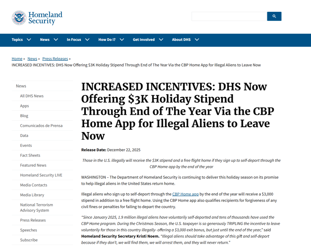美国国土安全部(DHS)已将无证移民自愿离境的“奖金”提高至原来的三倍。新闻报道截图