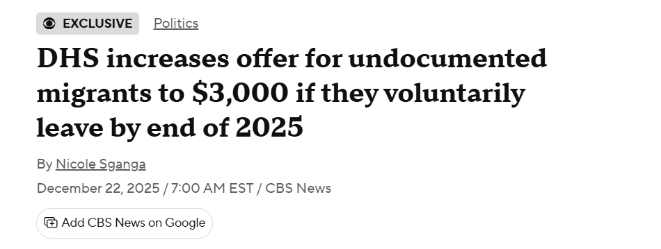 对于通过自行遣返方式、自愿离开美国的无证移民,相关经济激励从1000美元提升至3000美元,前提是当事人向美国政府登记,并在本自然年结束前离境。
