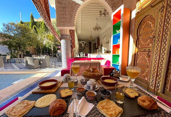 在菲斯老城一家豪华的摩洛哥传统庭院旅馆享用摩洛哥早餐