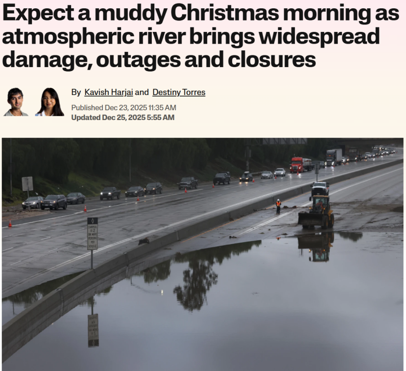 官员们已连续多日发出警告,称该风暴系统将在假期期间对南加州多地构成严重威胁。到周三(12月24日)中午,部分街道被淹没,一些道路被冲毁,另有一些道路则被迫关闭。