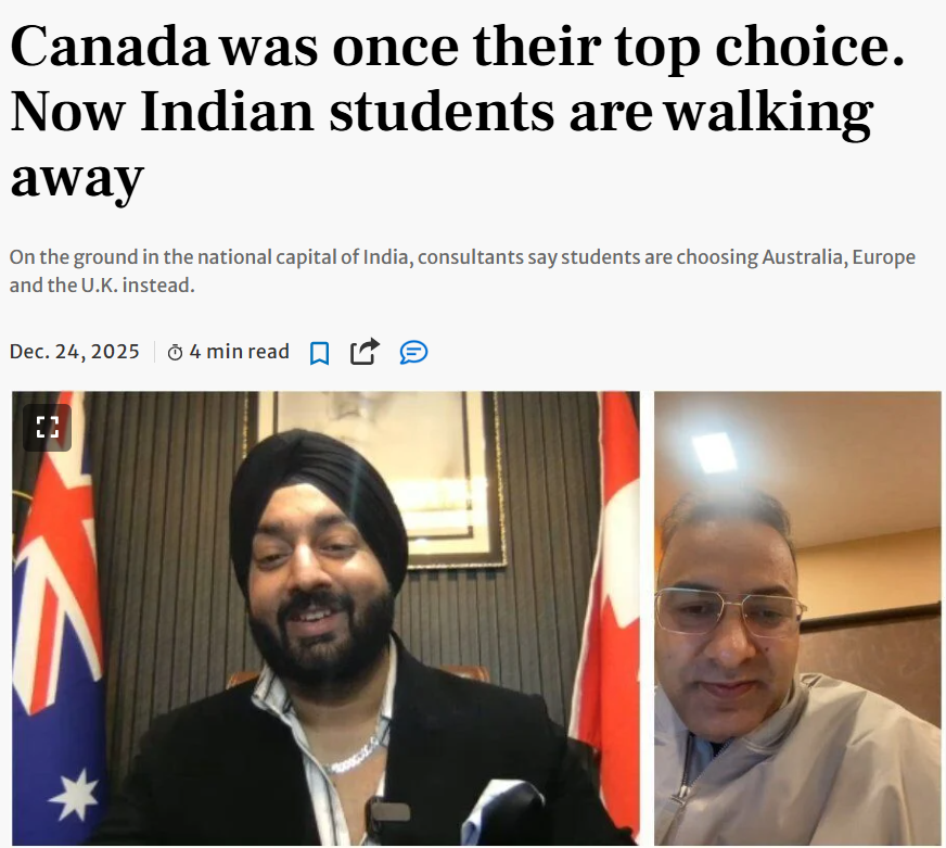 曾经是印度学生留学首选的加拿大,如今正面临学生源大幅减少的局面。Wave Visas 新德里团队负责人 Suraj Upadhyay 表示,以前每月有 200 到 250 名学生在教室接受加拿大留学培训,如今仅剩五到十人。过去两年,每年通过他们的渠道赴加学生仅 15 至 20 人,而此前这一数字超过 300 人。