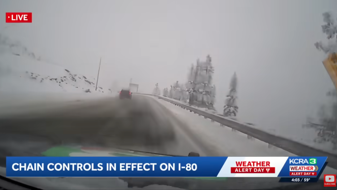 CHP表示,周四上午,80号州际公路 Nyack 至 Truckee 路段已实施防滑链要求,四轮驱动且配备雪胎车辆除外。以下路段同样需安装防滑链: