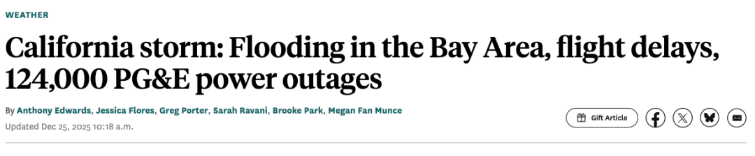 昨日深夜席卷北加州的暴风雨在圣诞节凌晨再度带来破坏性强降雨和大风。湾区部分地区发布暴雨预警,警告称强降水可能引发“危及生命”的紧急状况。尽管旧金山和圣马特奥县发布的山洪预警已于清晨6点解除,但不少居民醒来时发现街道被淹、树木倒伏,部分地区电力中断。图:新闻标题截图
