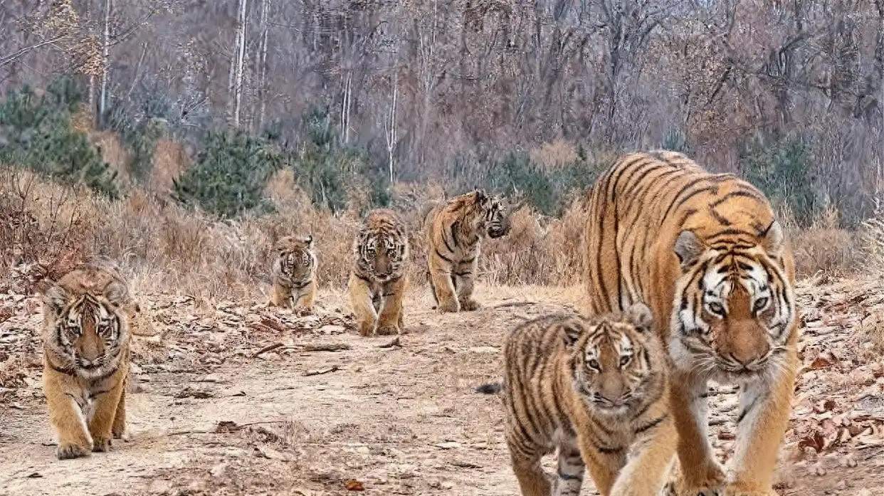 画面中,野生东北虎母虎带五只幼崽在林间行走。通过对个体体态、行走步态及体尺特征的分析判断,成年雌虎年龄约9岁,五只幼崽约 6–8 个月大。