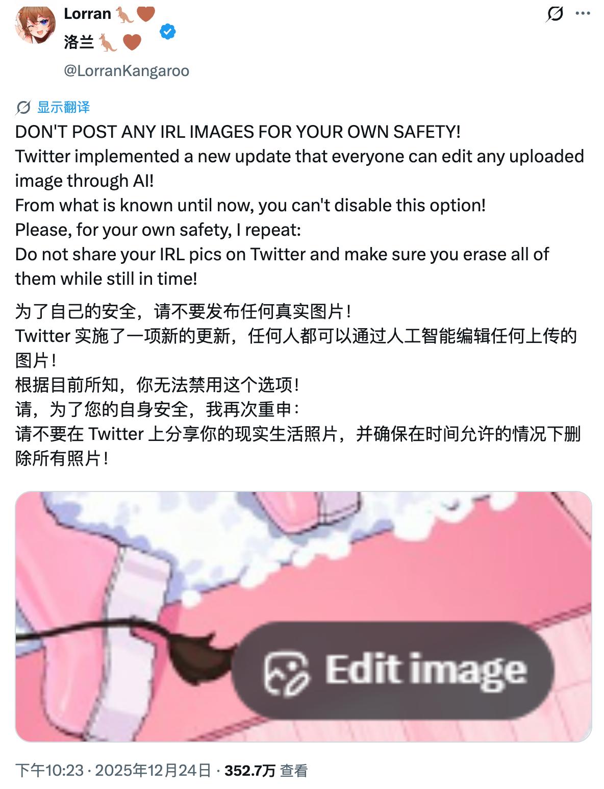 起因是社交平台 X 上线了一个基于 Grok 模型的「AI 编辑」功能。用户只需长按手机图片或点击网页版的「编辑图片」按钮,就能输入文字指令,让 AI 随意修改别人发布的作品。
