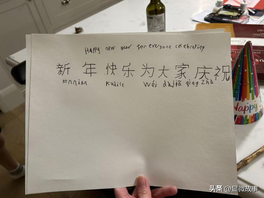 晚饭后,孩子们兴致勃勃地提议要学中文表达祝福。哥哥拿出一张白纸,打开翻译器,一笔一划地描出方块字。雇主拉着弟弟一起,录了“新年快乐”的祝福视频。