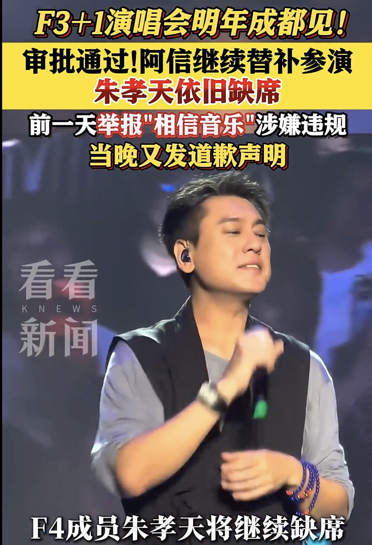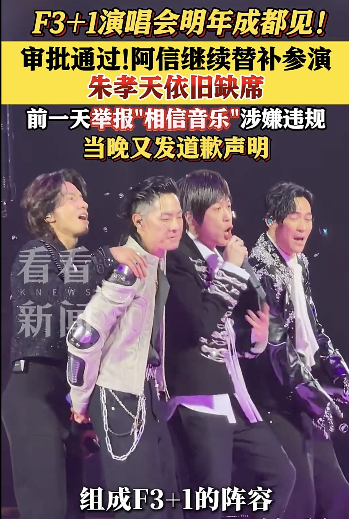 明年成都见!恒星之城巡回演唱会成都站通过审批,将于2026年1月9日至11日举行,F4成员朱孝天将继续缺席,由周渝民、吴建豪、言承旭和五月天主唱阿信组成F3+1的阵容。