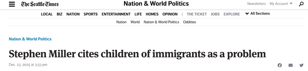 据西雅图时报12月23日报道 随着川普政府持续强化移民政策,其高级顾问斯蒂芬·米勒(Stephen Miller)近日在为政府的强硬立场辩护时,将矛头不仅指向新移民群体,也延伸至移民的后代。图:新闻标题截图