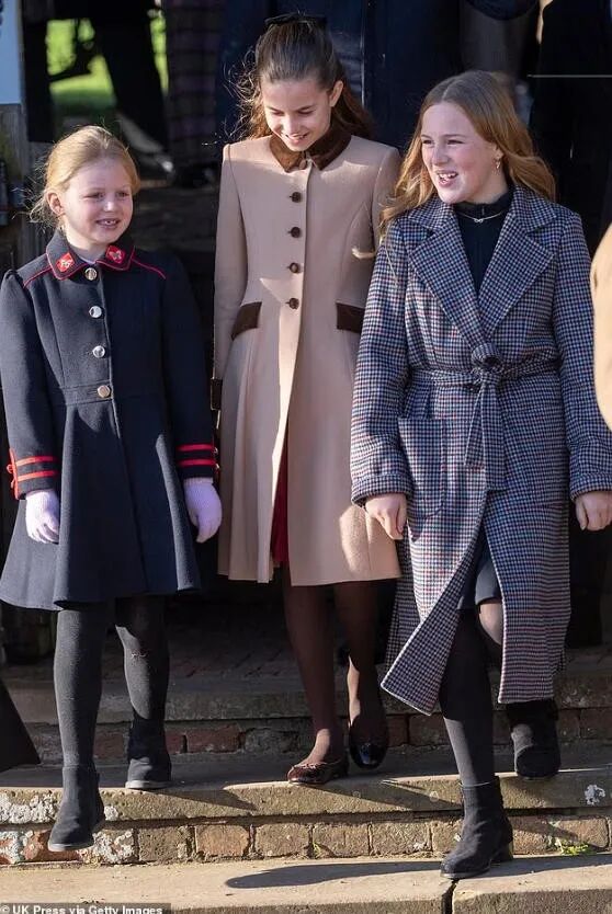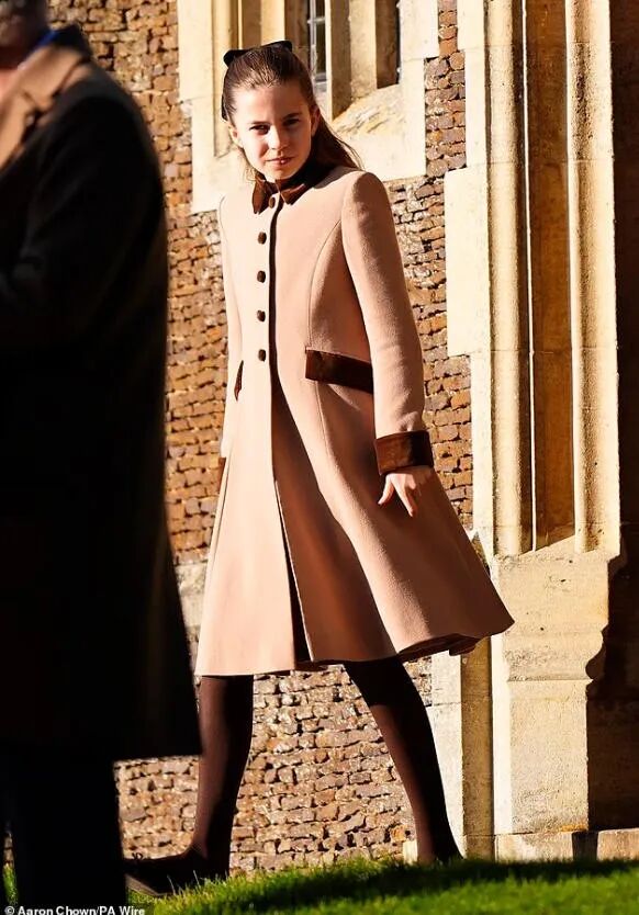 10岁的夏洛特跟妈妈一样,穿了一件卡其色拼接棕色的大衣,她现在长高了,像个小大人,很多人都觉得她长得跟已故的女王越来越像了。