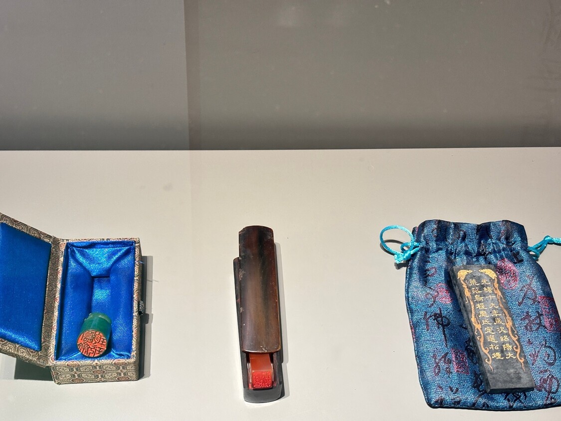 工作人员介绍,目前展陈的书画大多是仿制品,只有少数是庞左玉和庞莱臣本人书画的真迹,包含两幅庞左玉的扇形字画、两幅庞莱臣的对联及馆藏的三枚印章等。