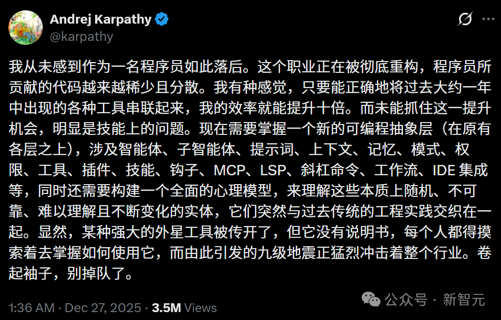 Karpathy总结说:如今,我们面临着一个全新的、必须掌握的编程抽象层(它叠加在原有的技术栈之上),其中涉及智能体、子智能体、提示词、上下文、记忆、模式、权限、工具、插件、技能、钩子、模型上下文协议、语言服务器协议、斜杠命令、工作流、IDE集成……
