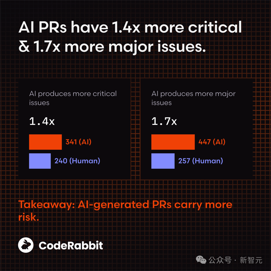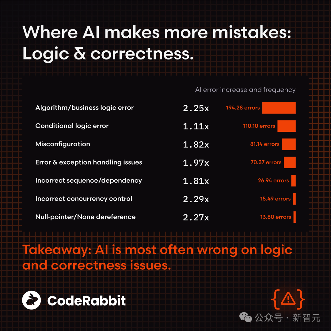 尽管AI在拼写和语法上比人类强两倍,然而一旦出错,就会上升到那种——深层次的逻辑谬误、功能正确性缺失以及代码可读性灾难。