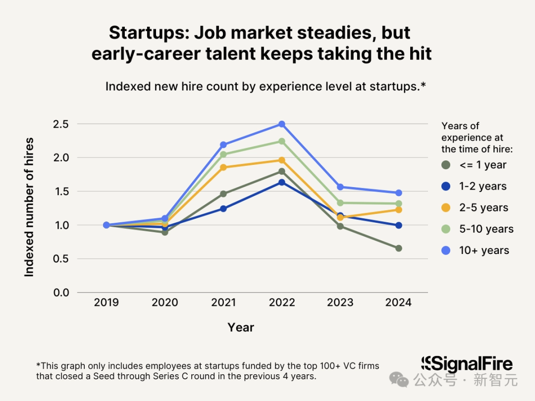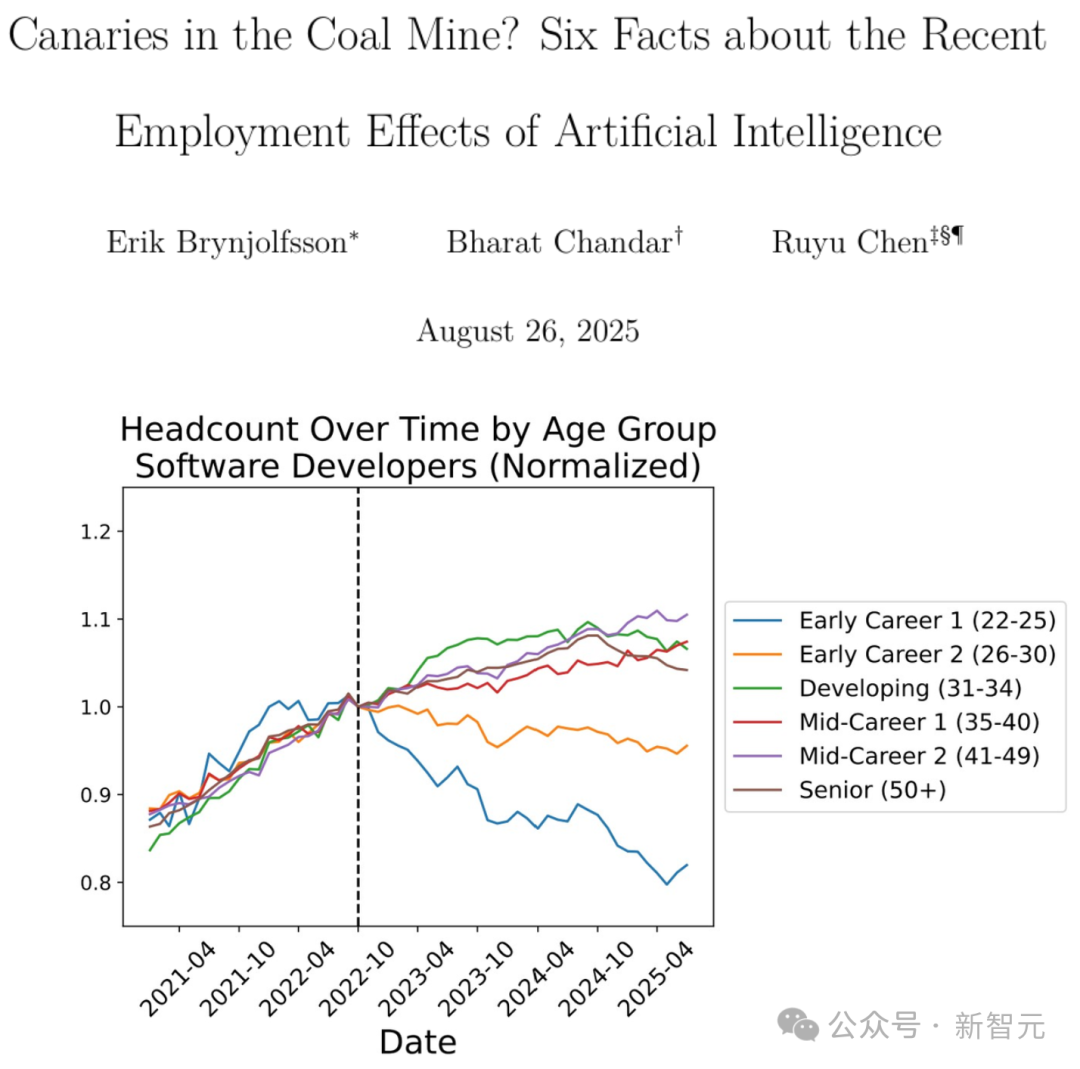 数据显示,年轻和年长开发者的就业情况直到2022年底是一致的。但从那时起,两者开始分化——年轻开发者开始失业,而年长开发者则没有。