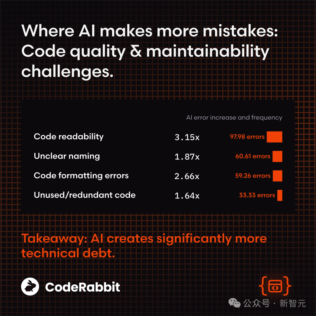 CodeRabbit的报告指出,这些问题正在像滚雪球一样累积成巨大的「长期技术债」。