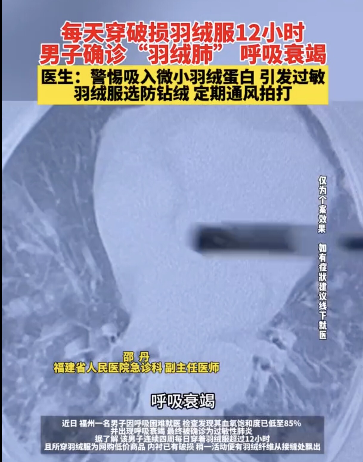 福建省人民医院专家接受采访时指出,羽绒中微小的蛋白颗粒被持续吸入肺泡后,即便对非过敏体质者,也可能引发免疫反应并攻击肺组织,因此这类问题也被称为“羽绒肺”。