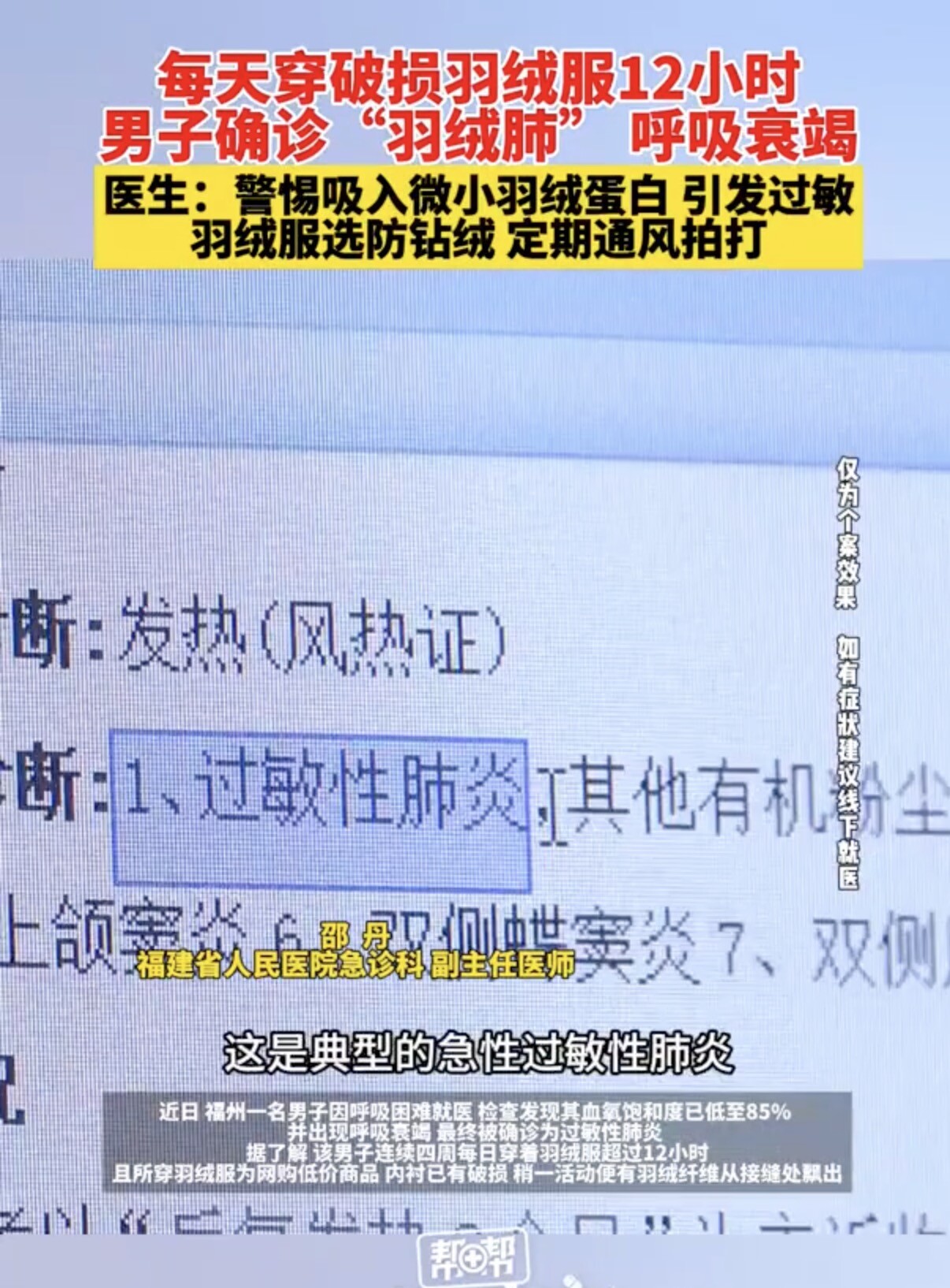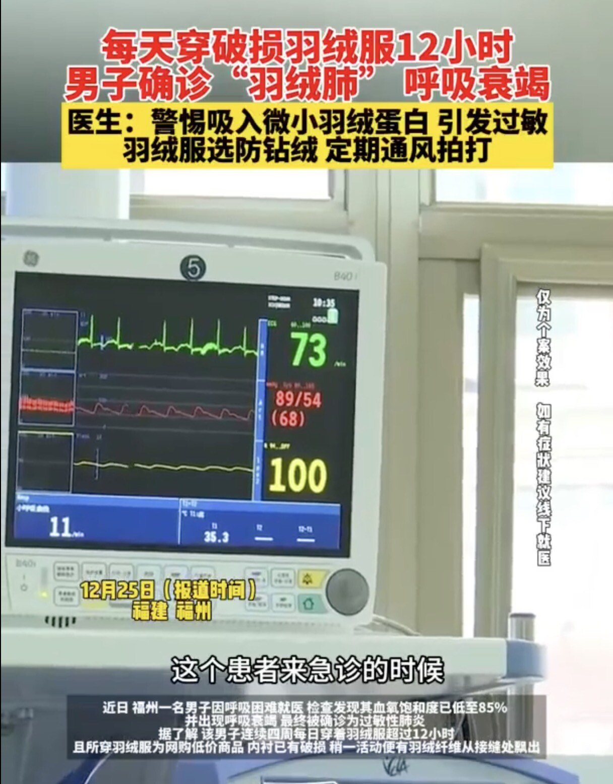 冬天穿羽绒服保暖,是再平常不过的事。一件破损羽绒服持续穿了四周后,福建一名男子的血氧饱和度已低至危险的85%,并出现呼吸衰竭,被确诊患上过敏性肺炎。