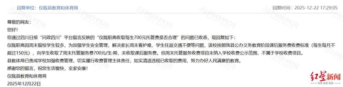 12月22日,仪陇县教育和体育局公开回复称,仪陇职高因周末留校学生较多,为加强学生安全管理,解决家长周末看护难、学生往返交通不便等问题,该校按照该县公办义务教育阶段课后服务费收费标准(每生每月不超过150元),向学生收取了周末托管服务费700元/生·期,未收取课后服务费。但周末托管服务收费项目未纳入学校收费公示范围,不属于学校收费项目。县教体局已责成学校加强收费管理,切实履行收费管理主体责任,如实清退违规已收取的费用。