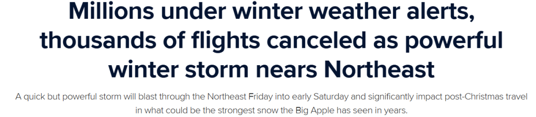 圣诞假期刚刚结束,一场威力强大的冬季冰风暴迅速席卷美国东北部地区,给假期返程和日常生活带来严重冲击。受风雪与结冰天气影响,从12月26日起,东北多州交通受阻、电力中断,航空系统陷入混乱,约2300万人的生活受到不同程度影响。据美国国家气象局与多家媒体综合报道,这场冬季风暴带来了大范围降雪、冻雨与强风,覆盖区域从纽约市、长岛、康乃狄克州,一路向西南延伸至新泽西北部、宾夕法尼亚州,以及纽约州哈德逊河谷、奥伯尼和宾汉顿等内陆地区。部分地区已出现道路结冰、能见度下降等危险状况,官方呼吁民众尽量避免外出。