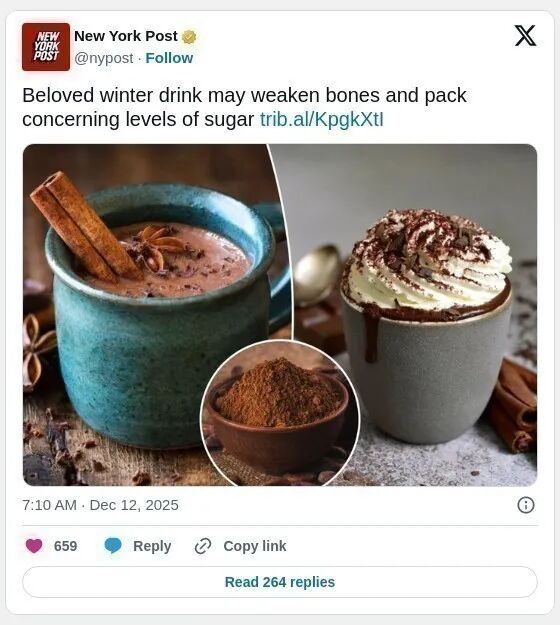 冬季是享受节日温暖饮品的季节,但专家提醒,一种看似舒适的饮料——热巧克力,可能比许多人意识到的更伤骨。加州Hoag骨科研究所的骨科医生杰里米·史密斯(Dr. Jeremy Smith)指出,尽管热巧克力通常用牛奶制作,但其高糖分可能削弱骨骼健康。一杯牛奶提供约300毫克钙,仅占成人每日所需1,000至1,200毫克的四分之一,而许多热巧克力中却含有20至60克糖,这相当于或超过两块普通糖果的含糖量,几乎达到美国心脏协会的每日糖摄入上限。