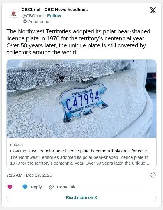 他认为,这种独特性使N.W.T.车牌成为世界上最受欢迎的车牌之一:“无论你的收藏范围有多大,几乎所有车牌收藏里都少不了北极熊”。