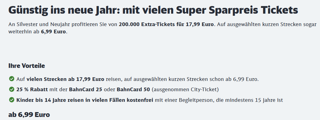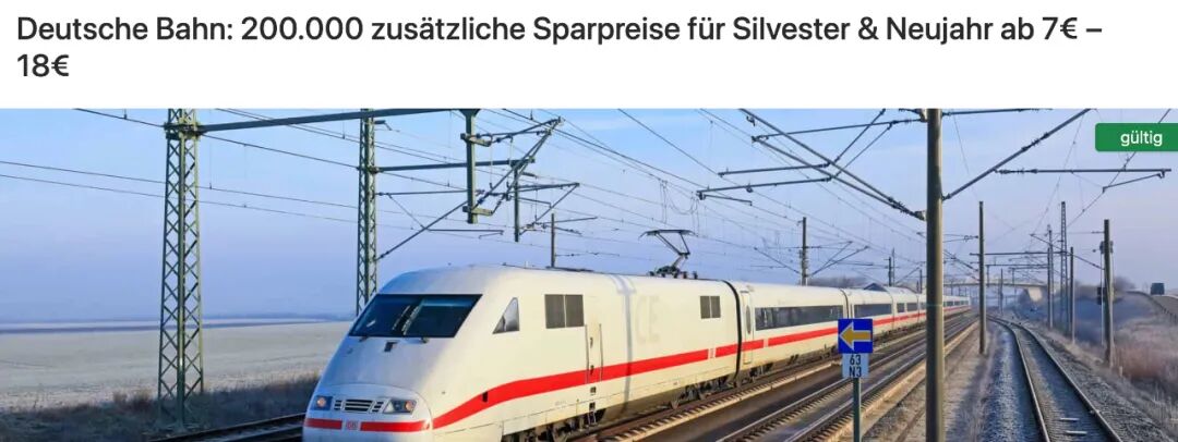 除了运行表现有所改善,德国铁路还在年末出行价格上释放了明显利好。为应对跨年期间的出行需求,Deutsche Bahn额外投放了20万张特别优惠车票,适用于 2025 年12月31日(除夕)和2026年1月1日(元旦)两天的列车行程,主要面向临时决定出行的旅客。
