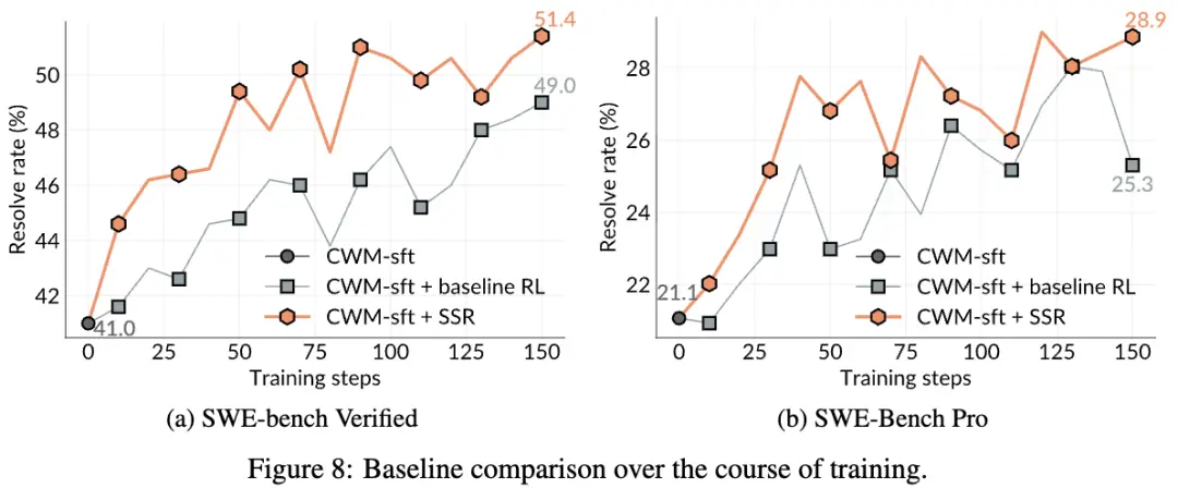 零样本泛化:SSR在训练时从未见过任何自然语言描述的Issue,它只看过代码和测试。但在测试时,它却能完美处理带有Issue描述的任务。这说明它学到的不是「做题技巧」,而是真正的「编程内功」。