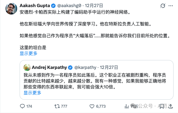 行业分析师Aakash Gupta点破了这场恐慌的根源:“卡帕西可是亲手构建了编码助手里神经网络的人。如果他都说自己‘严重落后’,那说明我们面对的局面已经彻底变了。”