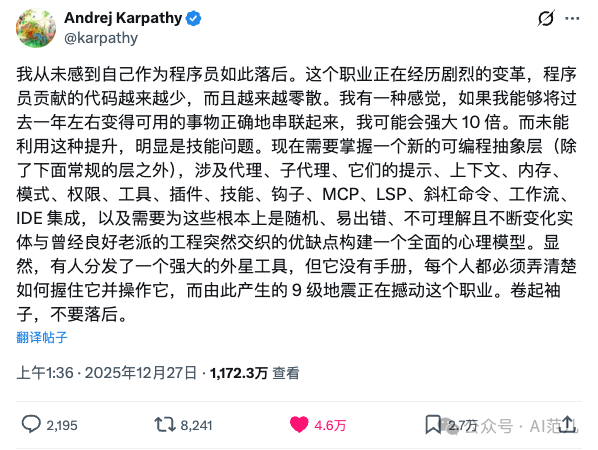 一条深夜推文,像一把匕首刺穿了整个科技圈的幻觉。当定义时代的大佬开始承认落后,意味着游戏规则已经彻底改写。“作为一名程序员,我从未感觉自己如此落后。”前特斯拉AI总监、OpenAI联合创始人安德烈·卡帕西(Andrej Karpathy)的这条推文,在深夜引爆了技术圈。