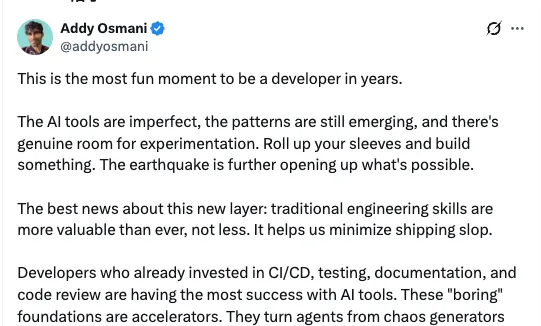 Google工程师Addy Osmani警告:测试、文档、CI/CD这些“枯燥”的基础工程能力,现在是你的救命稻草。