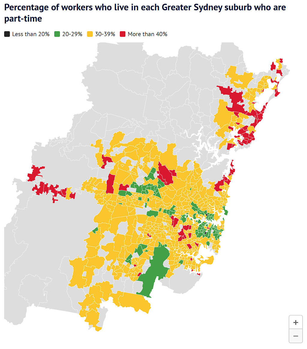2021年人口普查显示,大悉尼地区三分之一的劳动者为兼职(33.3%),略低于全国平均水平的36%。