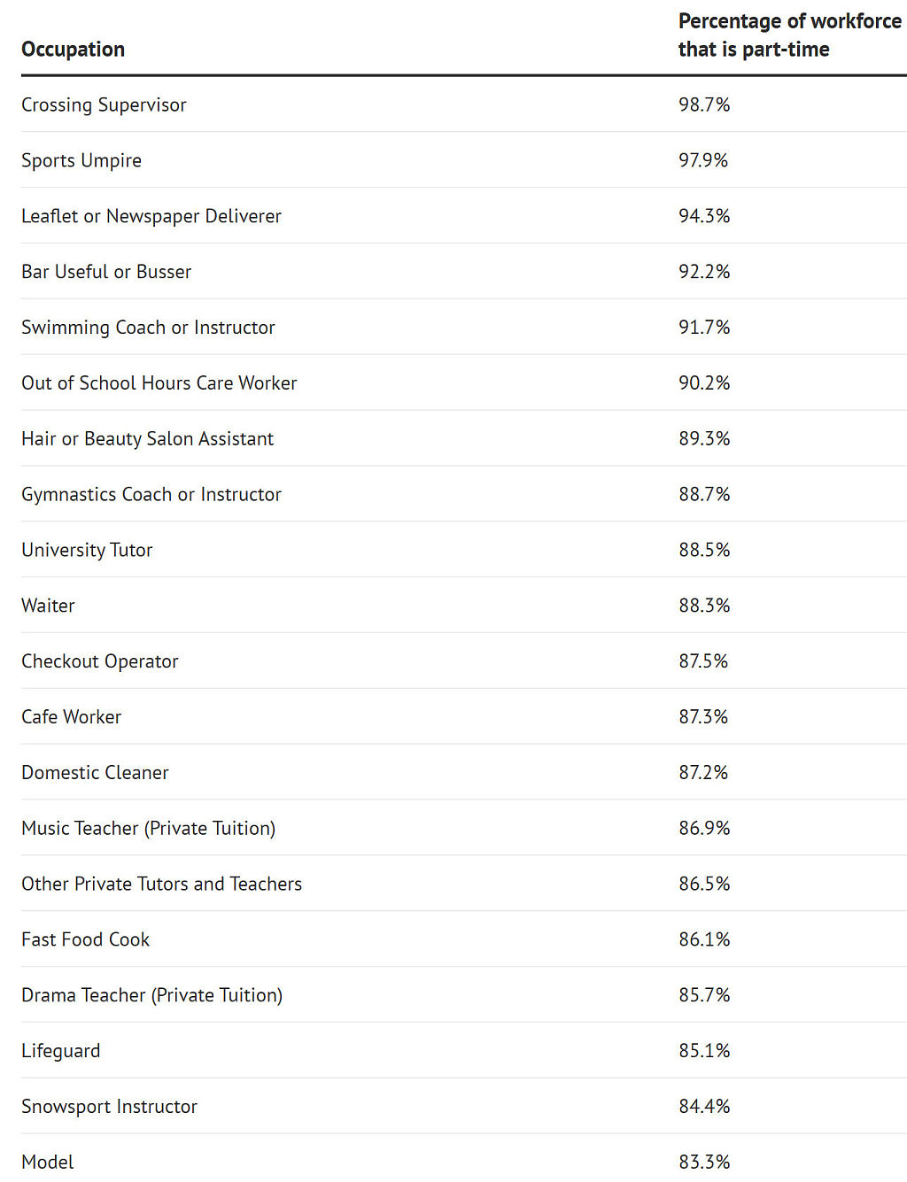某些职业在冬季工作时间较短,这也会影响数据。救生员在兼职比例最高的职业中排名第18位,但如果普查在夏季高峰期进行,结果可能会有所不同。
