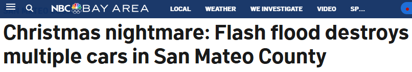 在圣马特奥县,戴利城(Daly City)和布罗德穆尔(Broadmoor)的街道两旁停满了一辆又一辆的汽车,其中数十辆在圣诞节清晨的突发洪水中被彻底毁坏。