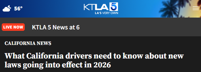 加州车管所(DMV)提醒司机,多项新法律将于2026年起陆续生效,旨在提升道路安全。(图源:KTLA报道截图)