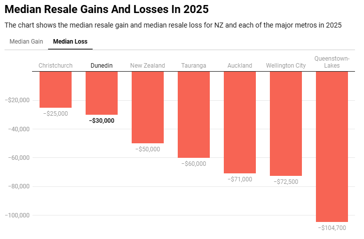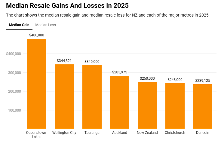 Southland的转售收益中位数为19.85万纽币,亏损中位数为1.65万纽币。而在皇后镇湖区(拥有全国最昂贵房产之一的地区),2025年转售收益中位数为48万纽币,是全国最高,尽管相比2022年峰值57万纽币有所回落;但其亏损中位数也高达10.4万纽币。