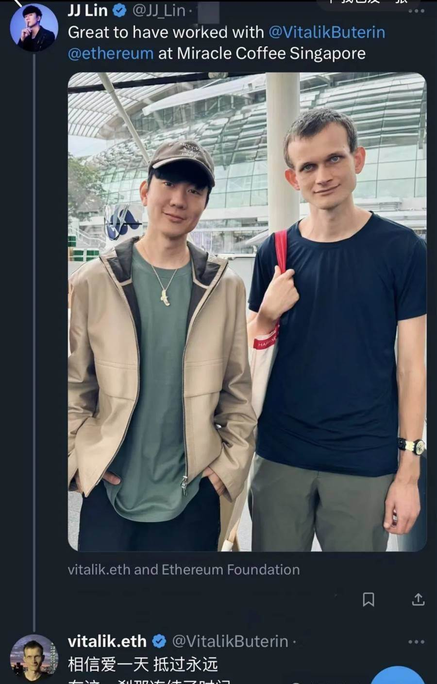 除了严肃的会议,V神的行程中也不乏轻松的插曲。他还抽空拜访了新加坡知名歌手林俊杰开的咖啡店,并与林俊杰合影留念。