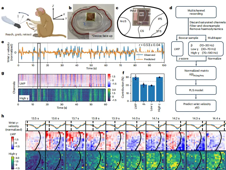 图丨行为性非人灵长类动物运动皮层的 BISC 记录(来源:Nature Electronics)