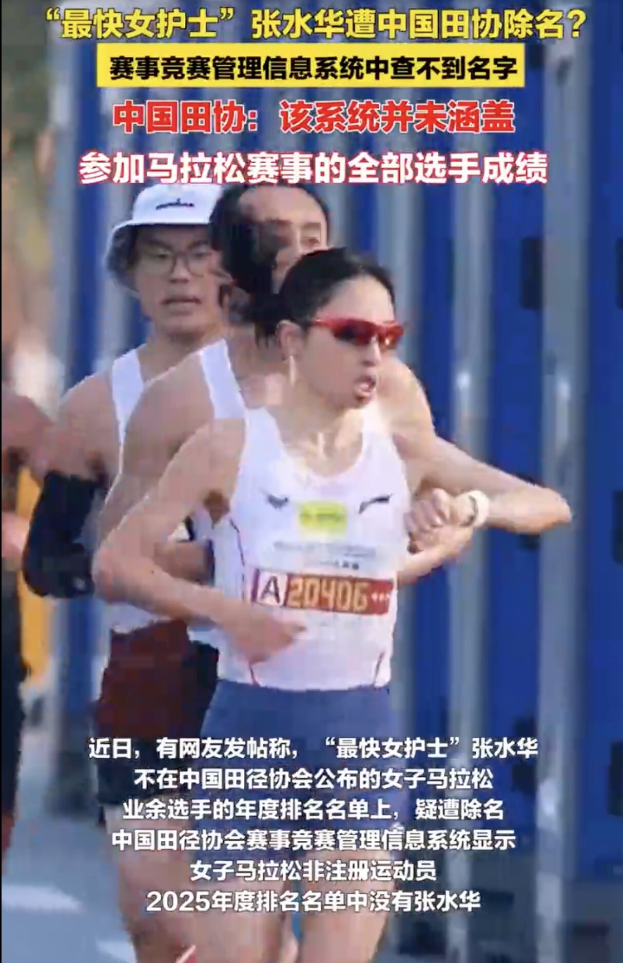 近日,有网友发帖称,此前因采访时表示“希望领导支持调休跑马拉松”引起轩然大波的“最快女护士”张水华不在中国田径协会公布的女子马拉松业余选手年度排名名单上,疑遭除名。中国田径协会赛事竞赛管理信息系统显示,女子马拉松非注册运动员2025年度排名名单中没有张水华。