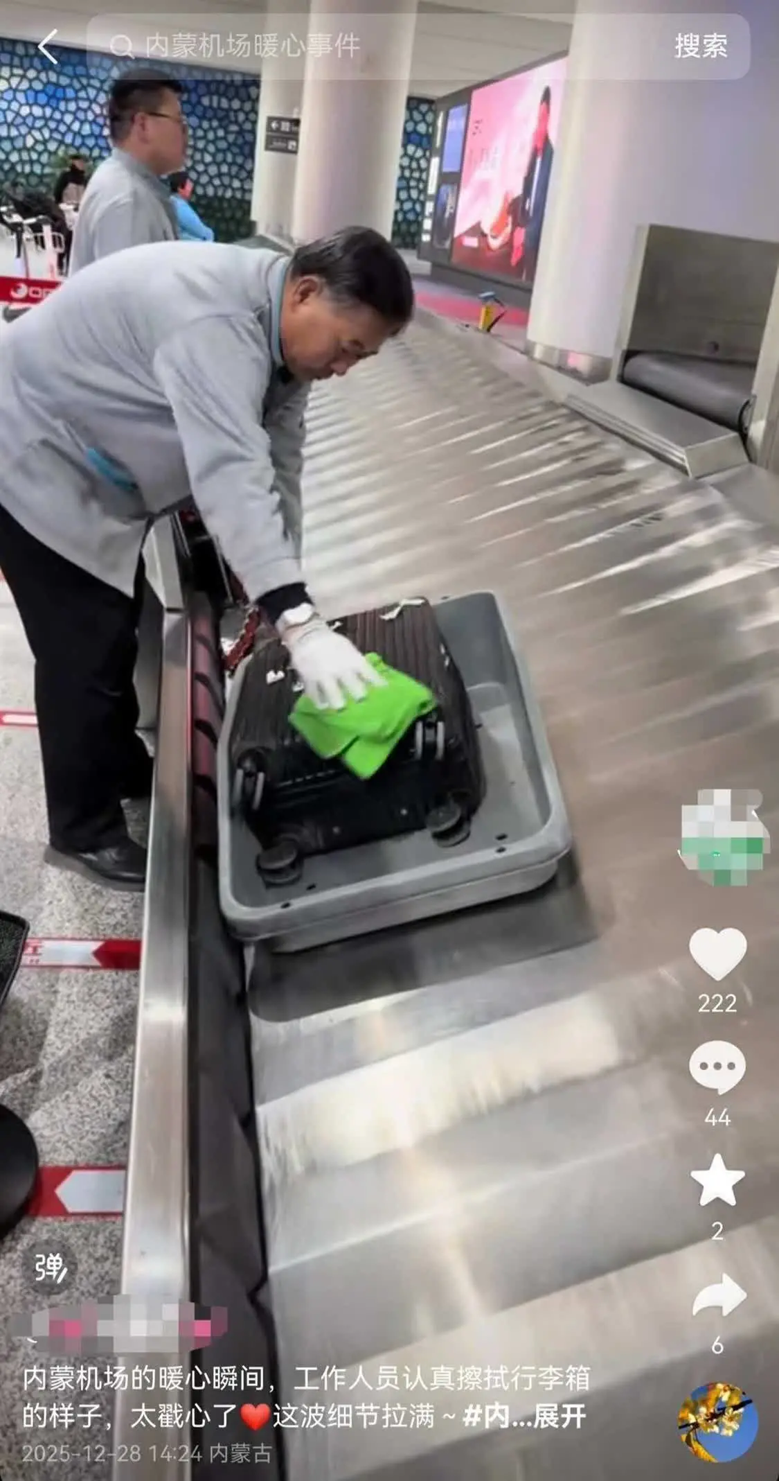 12月28日,有网友发视频称:“内蒙古机场的暖心瞬间,工作人员认真擦拭行李箱的样子,太戳心了,这波细节拉满。”视频显示,每隔五六秒钟,传送带上就下来一个行李箱,而且有专用的托盘装着,一名工作人员负责接应,一名工作人员用抹布擦拭朝上的一面。