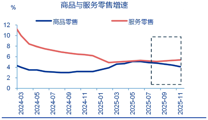 过去几年,服务消费的增长趋势要好于商品消费。如下图所示,根据申万宏源的数据,2024年3月以来,服务消费各月份增速均高于商品消费增速。
