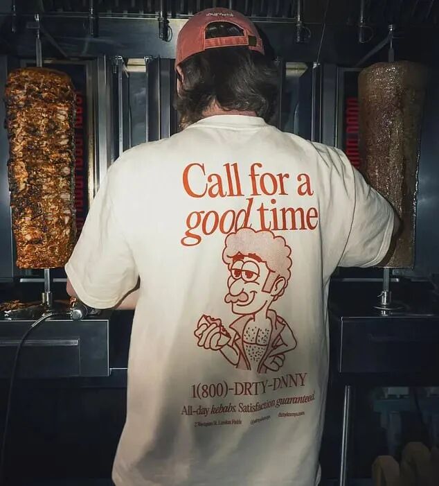 他给自己的烤肉店取名叫“肮脏唐尼”(Dirty Donny’s)。为了契合哈克尼区特有的复古时尚感,西蒙在视觉设计上颇费了一番心思。他创造了一个名为“唐尼”的卡通形象:浓密的鬈发、性感的胡须,胸前衬衫大开,露出一片充满雄性气息的胸毛。
