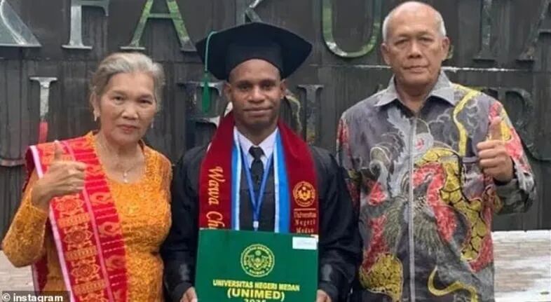 上个月,一位黑人小哥瓦瓦(Wawa Chombonggai)在社交媒体上庆祝了自己大学毕业。他手捧北苏门答腊大学的学位证,父母在他身边比出拇指,除了肤色和父母相差很远之外,这张照片似乎就没什么特殊的了。