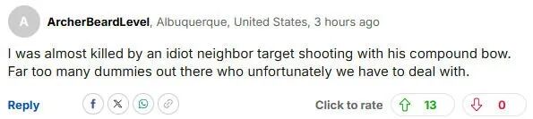 “我差点被一个用复合弓射箭的白痴邻居射死。可惜的是,我们不得不和太多这种蠢货打交道。”