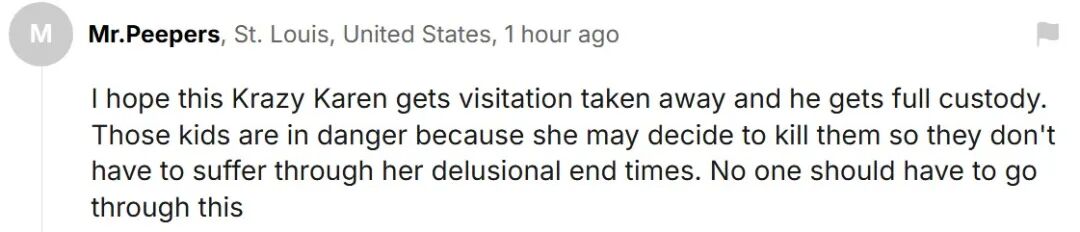 “我希望能剥夺这个疯女人的探视权,并把孩子的监护权全交给父亲。孩子们的处境很危险,因为她可能会杀了他们,来帮他们逃离她妄想中的末日景象。任何人都不应该承受这种痛苦。”