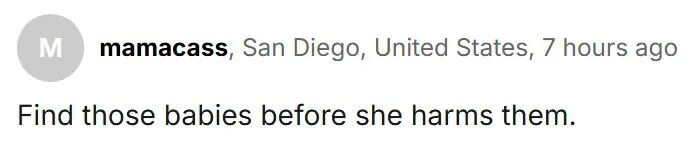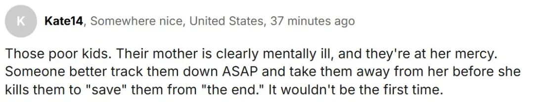 “孩子们太可怜了。他们的母亲显然精神有问题,而他们只能任由她摆布。希望有人能尽快找到他们,带他们离开母亲,免得她为了从‘末日’中‘拯救’他们而杀了他们,这种事也不是没发生过。”