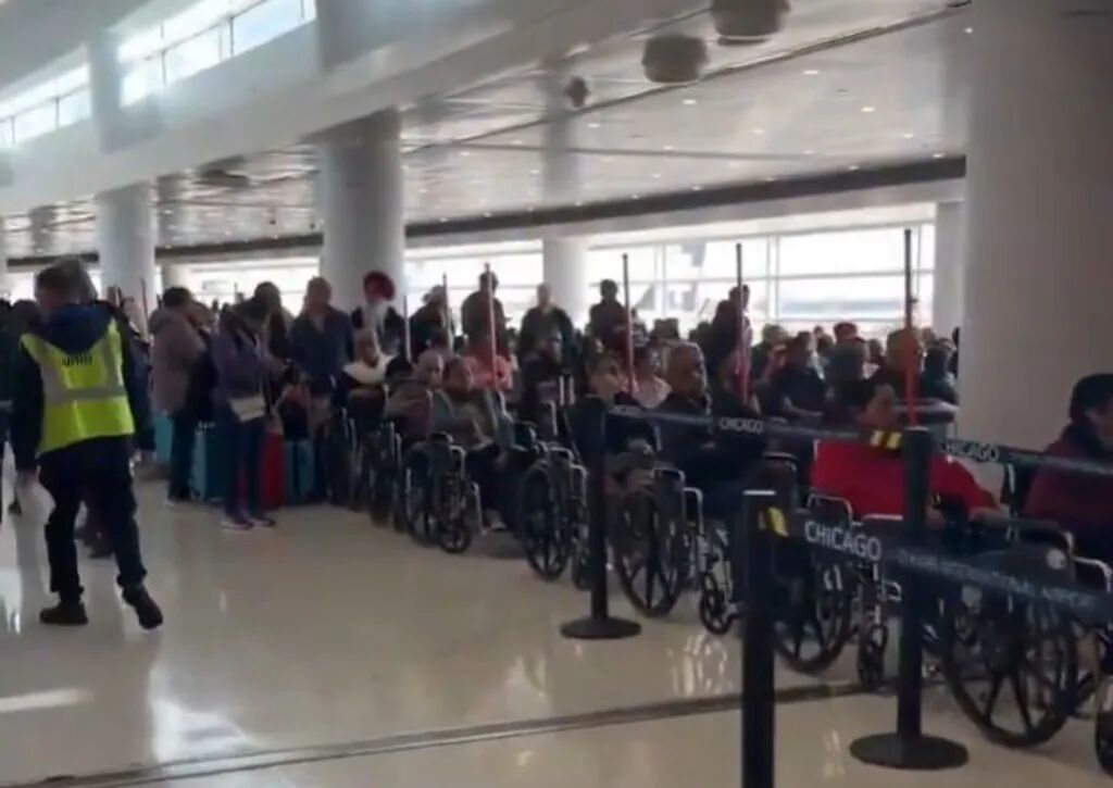 国际机场民众拍下惊人的轮椅长龙,因为坐轮椅可以优先登机,导致很多乘客模仿偷鸡。 (翻摄X/@bruce_barrett)