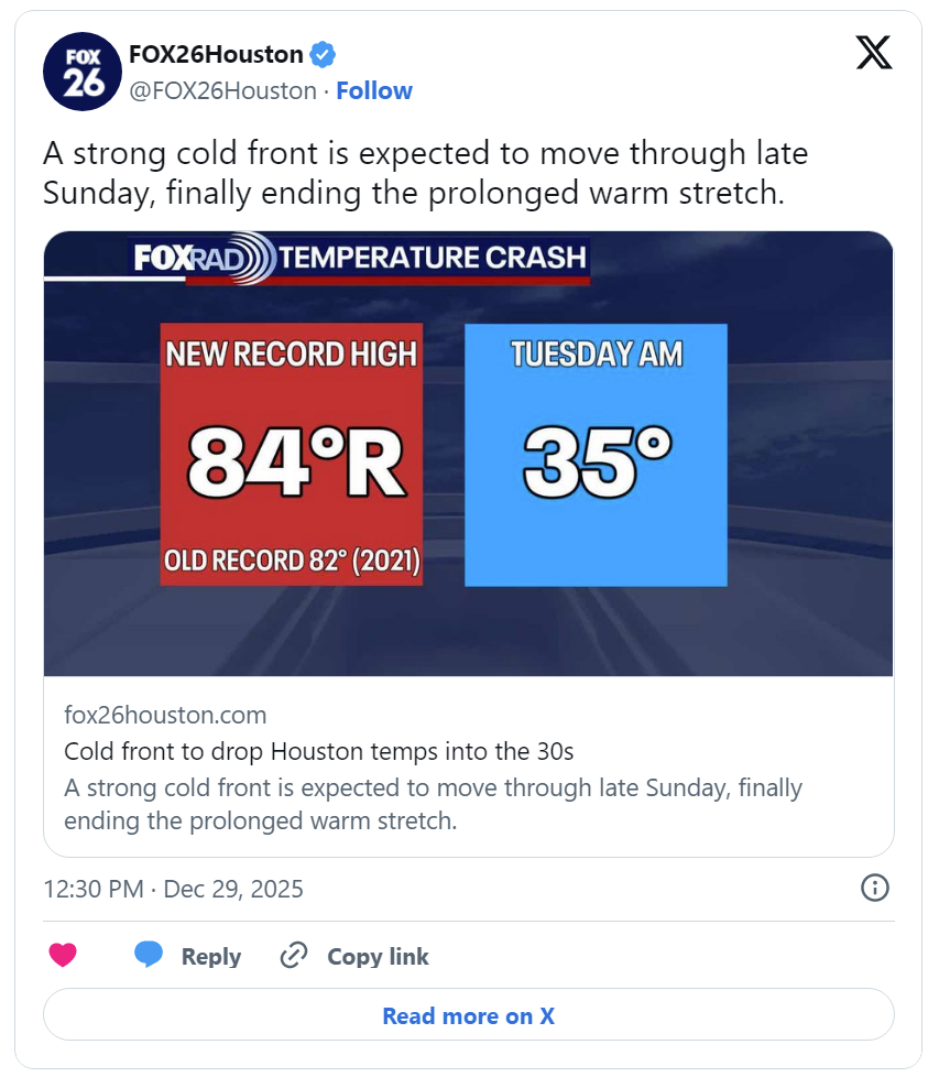 休斯顿的12月天气近乎异常,温暖的气温让人感到春意盎然。然而,这一切将迅速改变。根据福克斯新闻12月28日的报道,周六,休斯顿气温达到了83华氏度,追平了历史最高温纪录。而到了周日,该地区的温度更是突破了2021年的记录,布什洲际机场监测站的气温达到了84华氏度!这让休斯顿居民感受到了异常的温暖,气温屡次刷新历史记录,尤其是在下午时段。然而,这段温暖的天气将很快画上句号。预计强冷锋将在周日深夜过境,迅速终结这一持续的暖冬天气。冷锋来袭时,伴随而来的可能有阵雨和雷暴,但大部分恶劣天气将集中在休斯顿东北部的更远地区。尽管中西部地区可能面临1级或2级的严重天气风险,休斯顿本地的雷暴威胁相对较小。