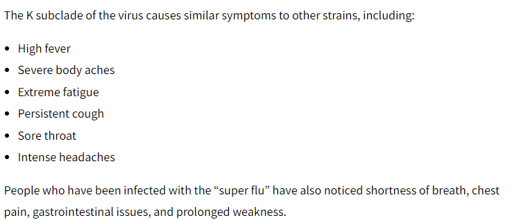 甲型 H3N2 流感病毒本身就以症状更重、康复周期更长著称,而 K 变种在传播性和感染后症状上也表现出更强的临床影响。感染者常见高热、剧烈全身疼痛、极度疲劳、持续咳嗽、喉咙痛及头痛,部分患者还可能出现呼吸急促、胸部不适、胃肠道症状及长时间乏力。